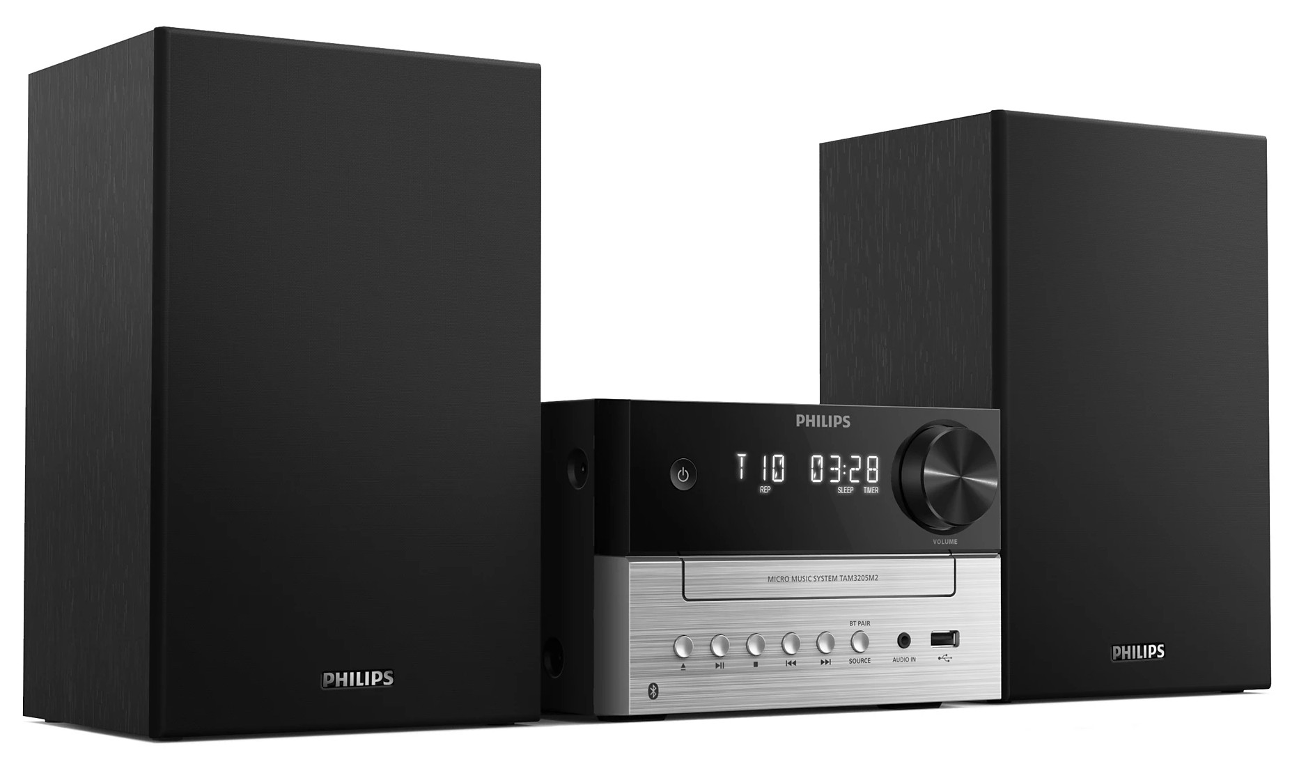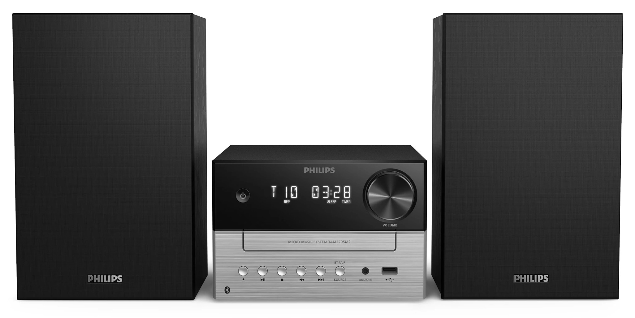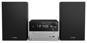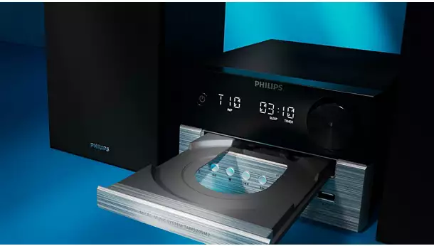 Dzięki subtelnie dwukolorowej jednostce centralnej i obudowom głośników, ta elegancka mikrowieża przypomina wzornictwo klasycznych urządzeń hi-fi. Kompaktowa konstrukcja sprawia, że łatwo jest znaleźć dla niej miejsce w domu, a z przodu urządzenia znajdują się przyciski do odtwarzania i wyboru źródła.