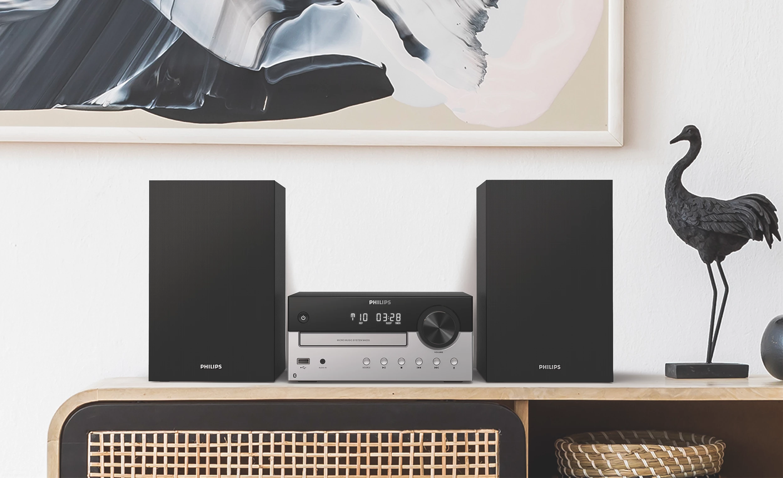 Ta mikrowieża o klasycznym wyglądzie pozwala przesyłać strumieniowo muzykę i podcasty, odtwarzać płyty CD i słuchać radia FM — a wszystko to w bogatym brzmieniu o mocy 60 W. Idealnie nadaje się do otwartych pomieszczeń mieszkalnych i umożliwia podłączanie innych źródeł za pośrednictwem USB lub wejścia audio.