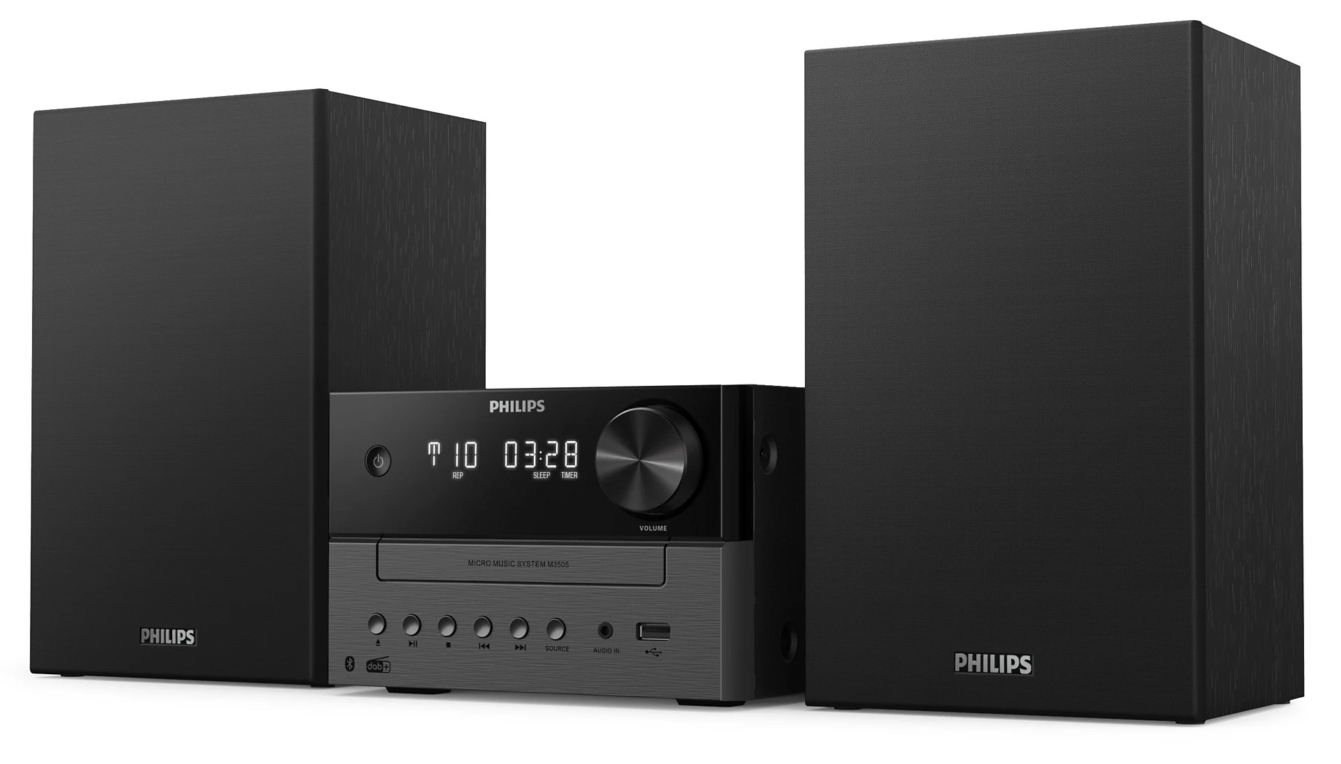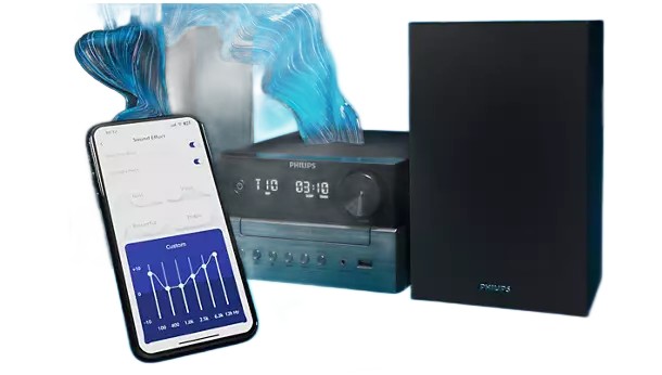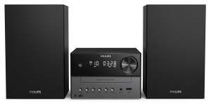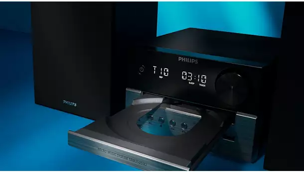 Dzięki subtelnie dwukolorowej jednostce centralnej i obudowom głośników, ta elegancka mikrowieża przypomina wzornictwo klasycznych urządzeń hi-fi. Kompaktowa konstrukcja sprawia, że łatwo jest znaleźć dla niej miejsce w domu, a z przodu urządzenia znajdują się przyciski do odtwarzania i wyboru źródła.