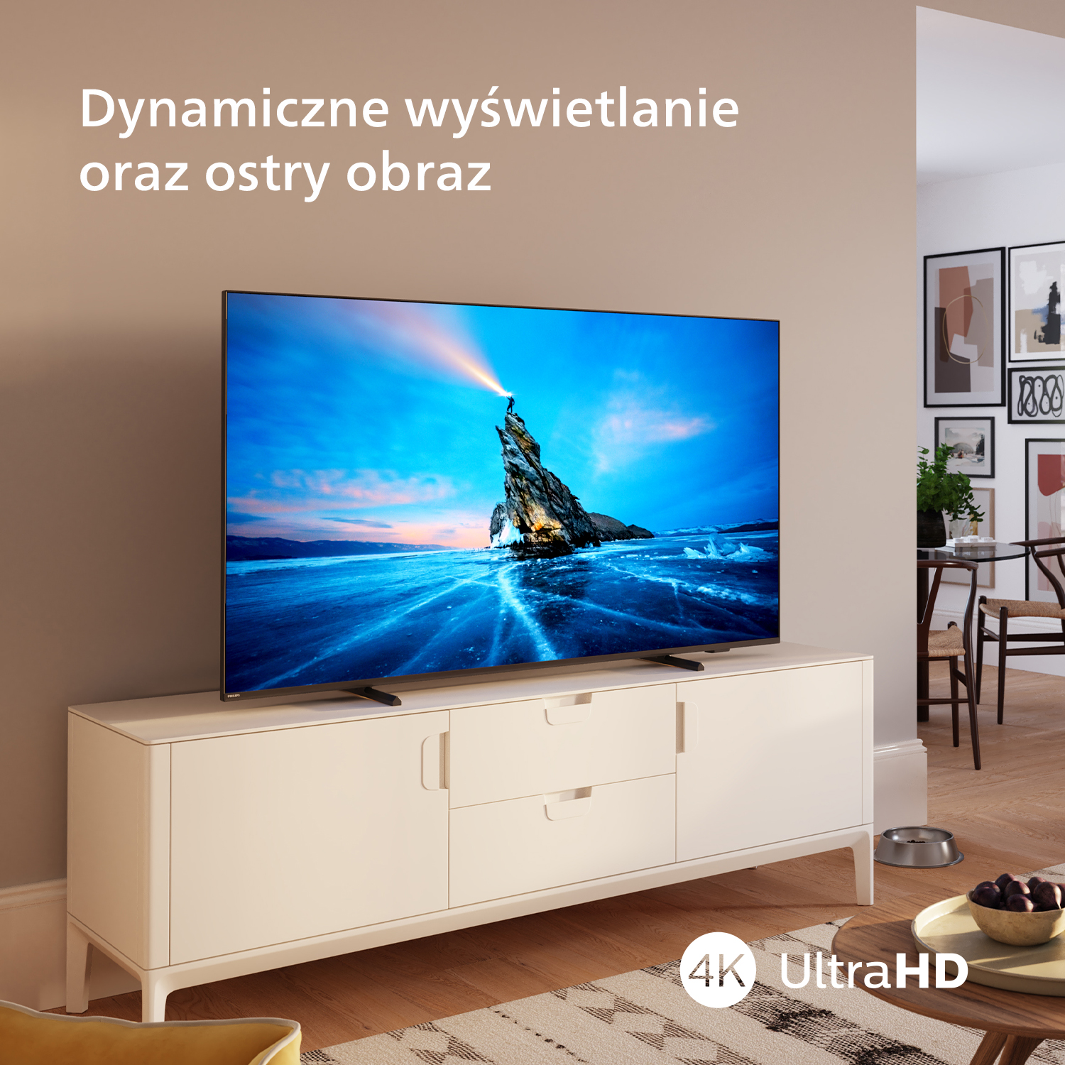 Dzięki niemal bezramkowemu ekranowi ten elegancki telewizor 4K Smart wygląda świetnie w każdym pomieszczeniu. Pilot do telewizora wykonany jest z plastiku pochodzącego z recyklingu, nasze opakowania są wykonane z kartonu z recyklingu z certyfikatem FSC, a wkładki są drukowane na papierze z recyklingu.