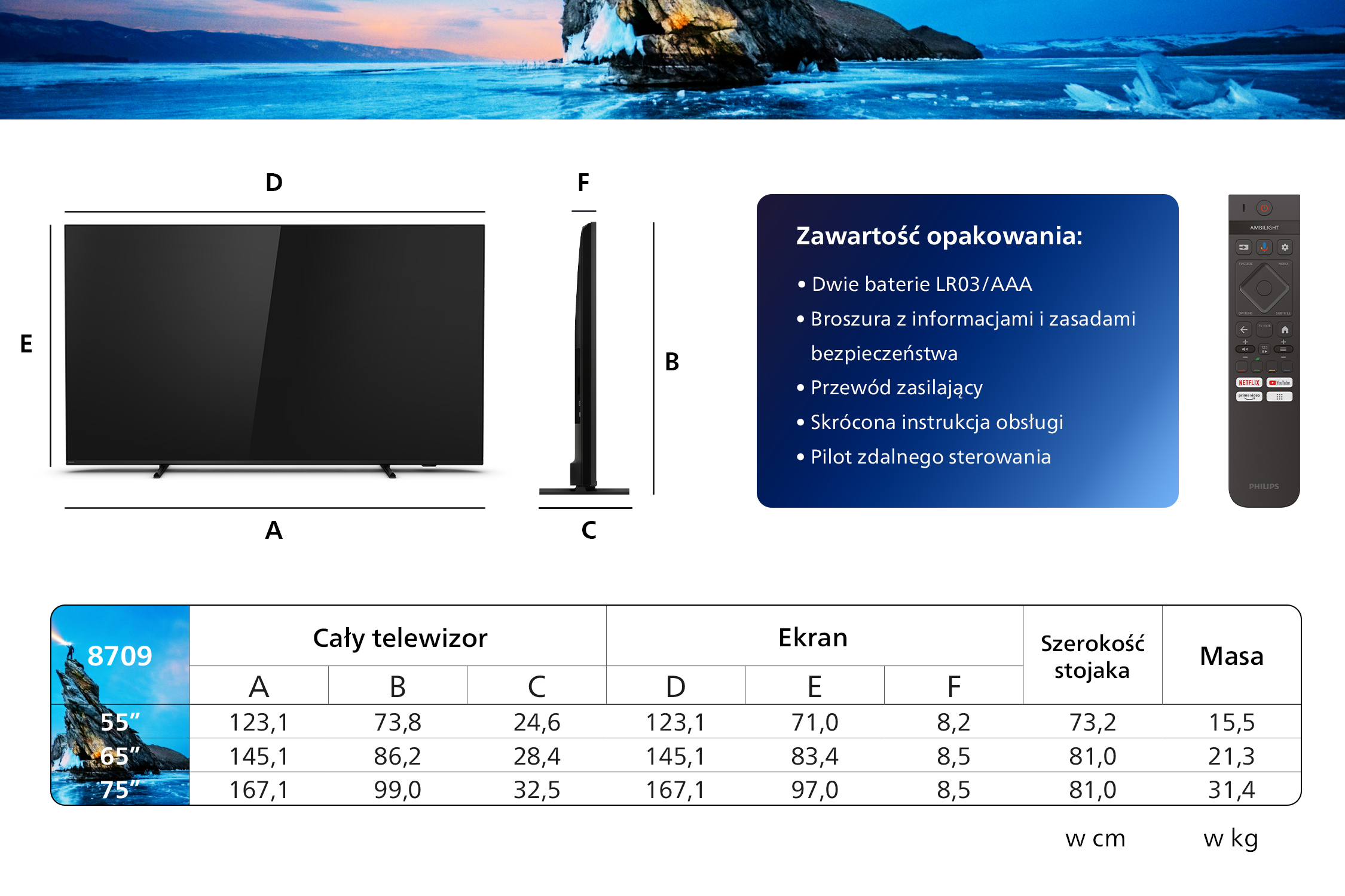 • Telewizor bez podstawy (wys. x szer. x gł.): 843 x 1450 x 85 mm